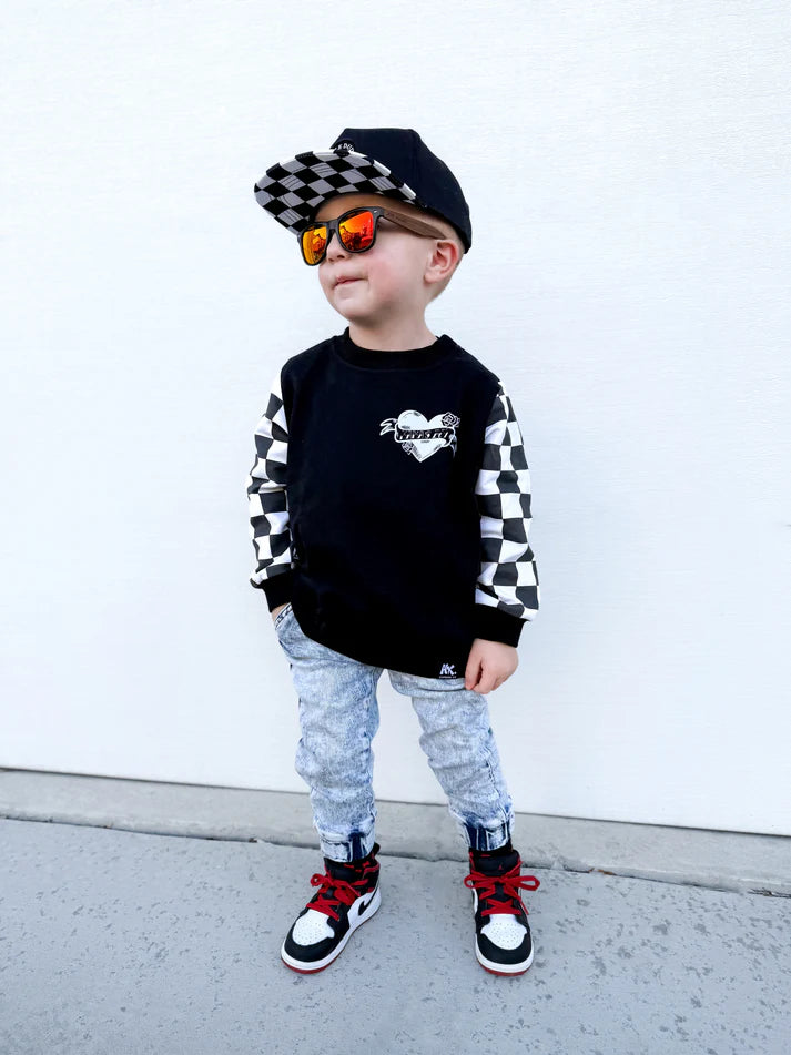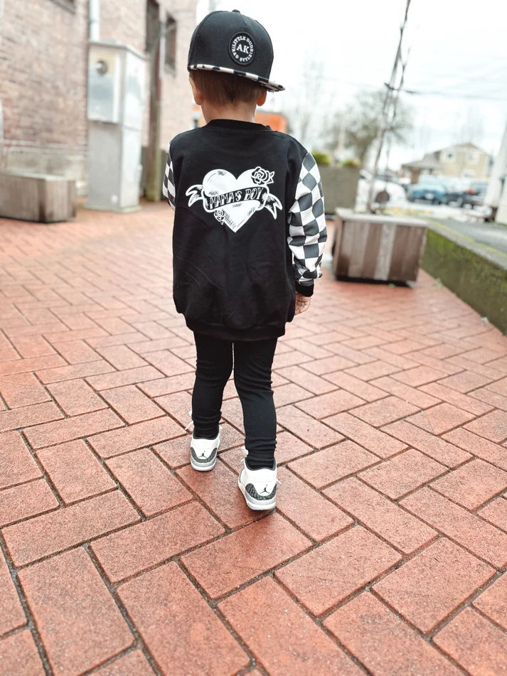 Mama's Boy Checker Crewneck Our exclusive design returns in an oversized silhouette with a playful checker pattern on the sleeves.... Read more